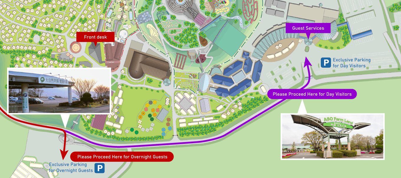 주차장은 '숙박자 전용 주차장'과 '당일 방문객 전용 주차장'의 2가지 종류가 있습니다.(총 2,500대 주차공간)