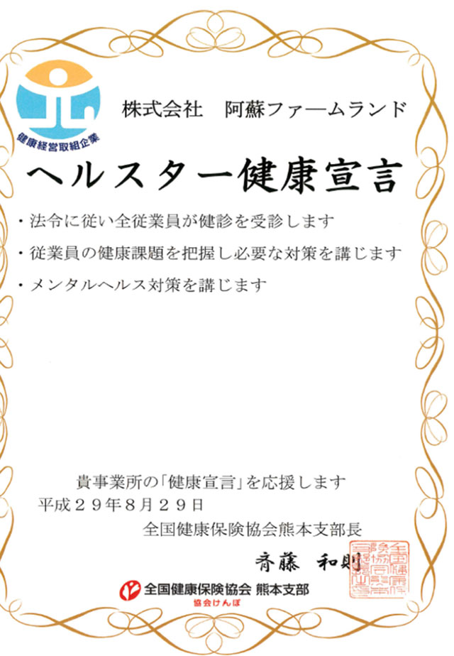 2018년 협회 겐포 구마모토 지부는 건강스타 건강선언을 발표하고, 일본건강협회와 경제산업성에 건강생산성경영기구 인증제도를 신청하여 평가를 받았습니다.