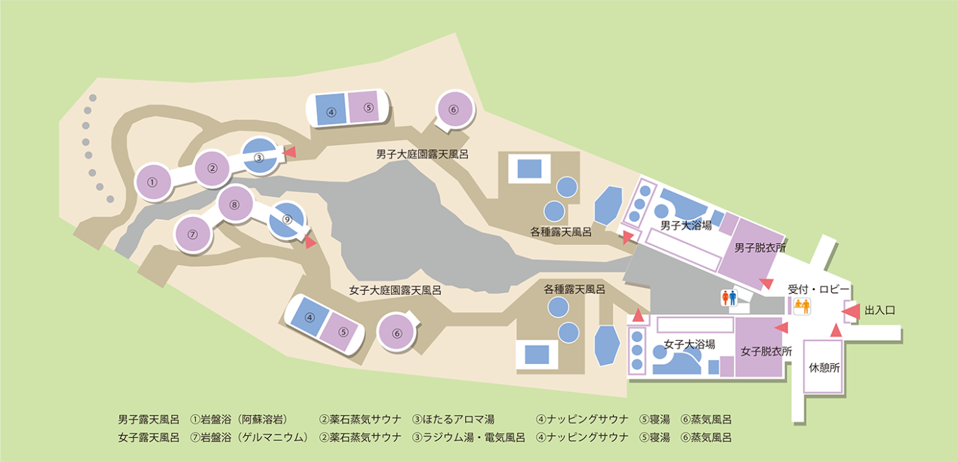 대자연 아소 건강의 숲자연을 체험할 수 있는 세심하게 디자인된 건강온천을 제공합니다.목적이나 신체상태에 따라 조합하여 사용하시기 바랍니다.