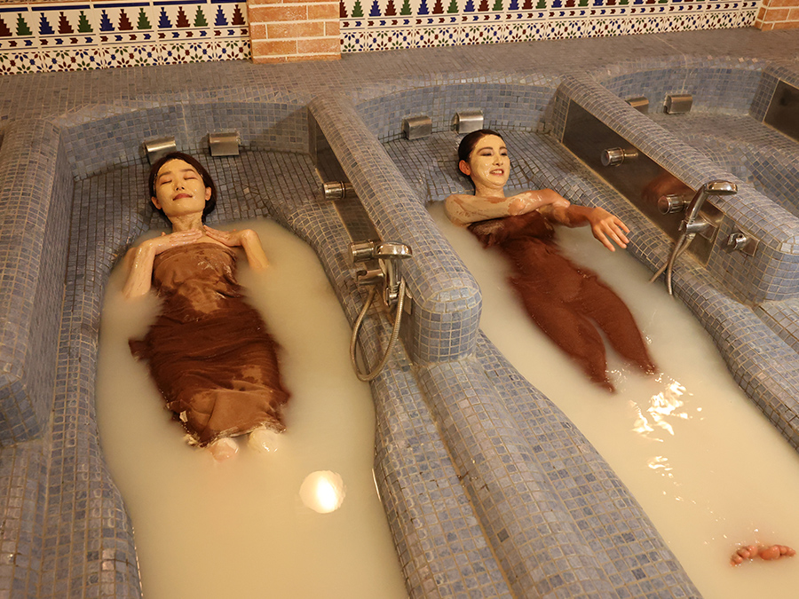 신경 쓰이는 부위에 클레이를 바르고 잠시 휴식을 취하세요.일상의 피로를 잊게 해주는 시간을 보내실 수 있습니다.팩을 마친 후 별도의 욕조에 뜨거운 물을 채우고 누워 '머드욕'을 체험할 수 있다. 온몸의 긴장을 풀고 대지의 은혜를 온몸으로 느낄 수 있는 순간이다.