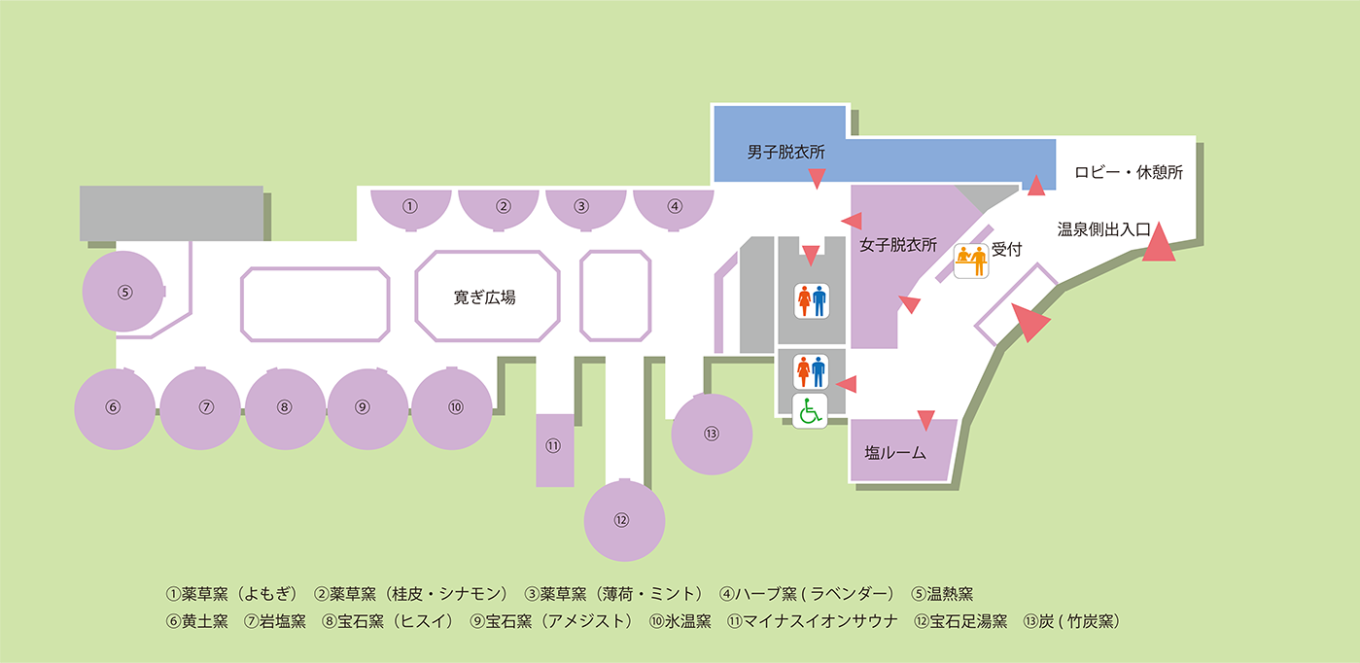 대자연 아소 건강의 숲자연을 체험할 수 있는 세심하게 디자인된 건강온천을 제공합니다.목적이나 신체상태에 따라 조합하여 사용하시기 바랍니다.