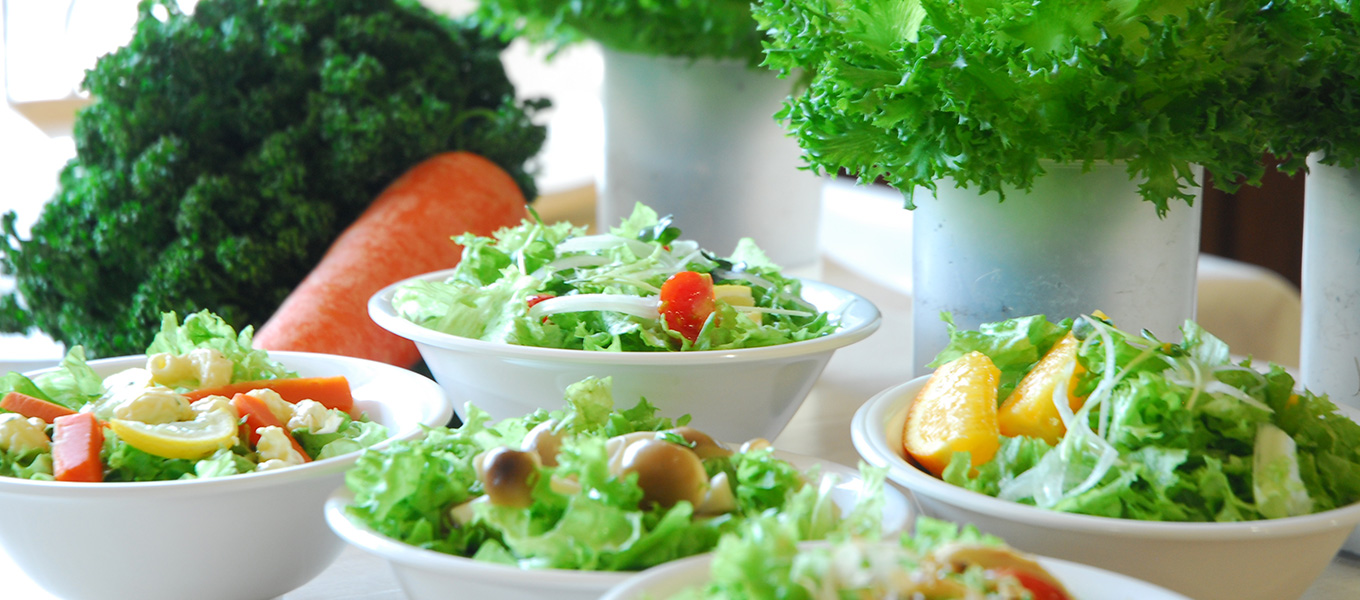 구내 농장에서 직접 재배한 신선한 야채로 구성된 샐러드 뷔페 코너도 마련되어 있습니다.